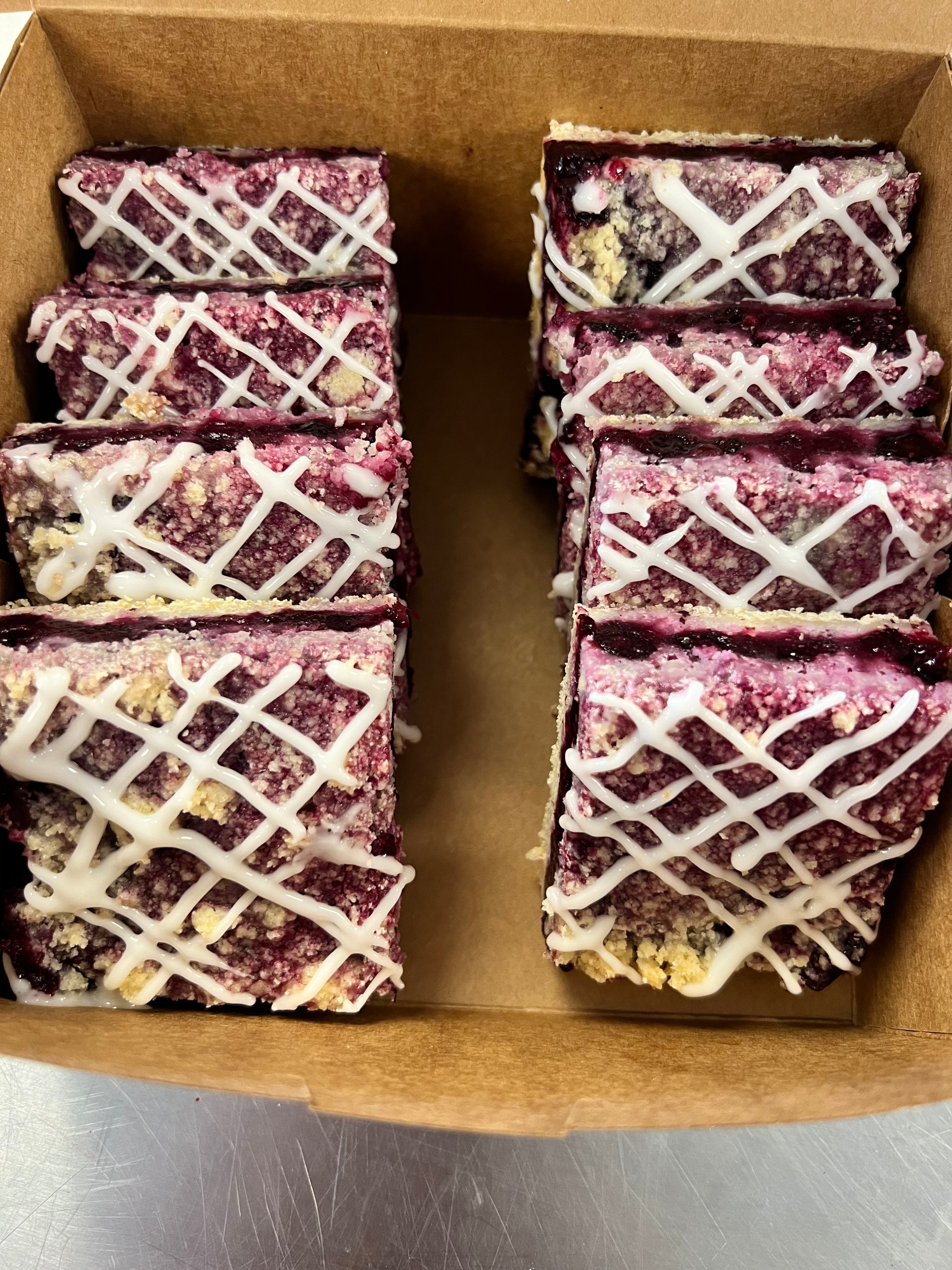 Butter crust topped with blueberries. Finished off with a crumble topping and glaze.
